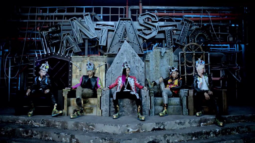 Boom Shakalaka ! Après un an d’absence, ou presque, BIGBANG faisait son come back début 2012 avec l’album Alive et notamment avec le tube Fantastic Baby. Du haut de ses 60 millions de vues et des poussières, le clip de Fantastic Baby a squatté 4 mois durant le YouTube 100. L’histoire plante son décor dans un monde futuriste où la musique, la danse et tout ce qui peut permettre aux jeunes de s’amuser a été banni par les autorités. Jusqu’à ce que des rebelles se jettent contre les forces de police, réveillant du même coup cinq rois de la pop emprisonnés. Notons que les conditions d‘emprisonnement sont parfois surprenantes : G-Dragon coincé sur un trône en miettes, Taeyang congelé dans un temple, T.O.P enfermé dans un tableau, Daesung enchaîné dans une prison… Seungri, lui, est plutôt en bonne compagnie, cerné par quatre geôlières en combinaison de cuir moulante (miaou !).