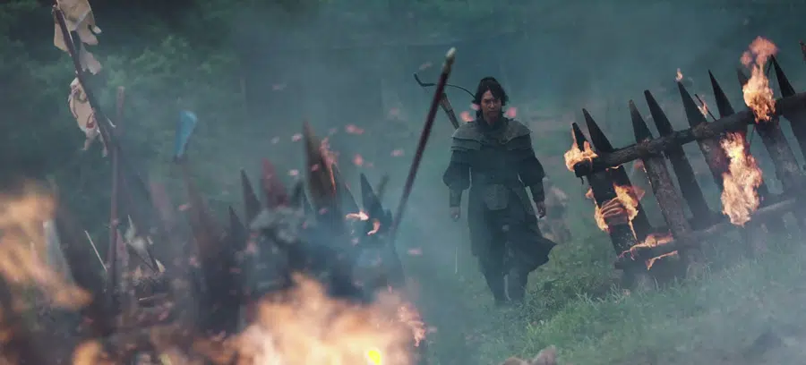 Le même épisode comporte une autre scène de guerre d’envergure, qui voit cette fois Hwi affronter depuis le sol des soldats chargeant à cheval. Là encore, le réalisateur enchaîne les compositions de plans dynamiques et inspirées autour de son héros en action.
