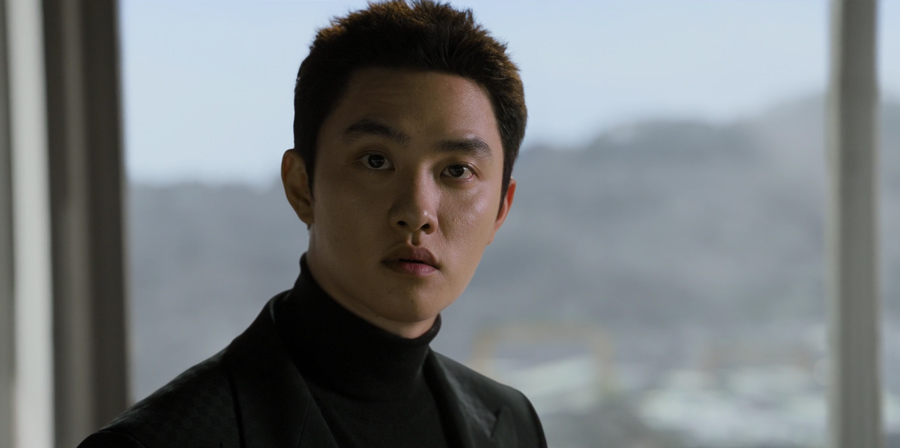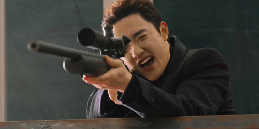 Pendant ce temps, Yo Han pète un câble en haut de sa tour. Il saisit de manière théâtrale un fusil de sniper planqué sous la table basse, sous les yeux sidérés de ses invités, pour abattre lui-même Tae Joong. Son intervention armée dans le combat est introduite par deux plans en contre-plongée, traduisant son sentiment de toute puissance. Par la suite, la réalisation multiplie les plans où Yo Han, en véritable prédateur, pointe l’arme dans notre direction, soulignant la menace imminente qui pèse sur notre héros.