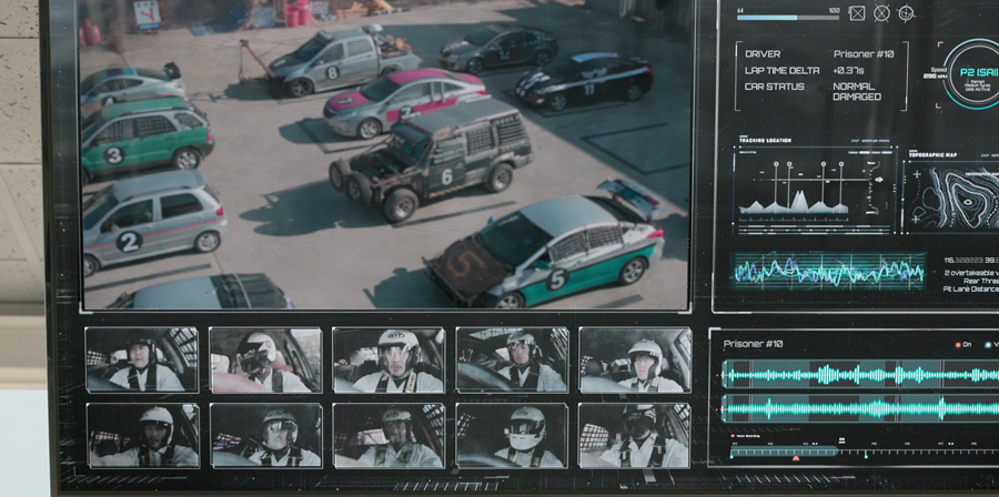 La scène d’action, qui se déroule presque en temps réel (quelques brefs flashbacks interviennent ici et là), est découpée en trois actes, dont le premier est celui de la course de voitures : les détenus doivent effectuer vingt tours de piste.