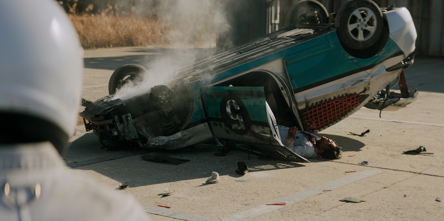 L’hostilité entre les deux hommes est scellée par un nouvel échange de regard par caméra interposée (46 minutes 22). Ce plan fait écho à celui qui précédait la course, mais la donne a changé. La seconde qui suit, Tae Joong envoie la bouteille de gaz dans le décor. Arrivant face à la caméra, celle-ci fracasse le drone. La musique s’arrête pour laisser place au son aérien du vol de la bouteille, qui ressemble à celui d’un missile, avant qu’elle ne fasse exploser un véhicule et plusieurs barils, donnant lieu à une explosion digne d’un film hollywoodien.