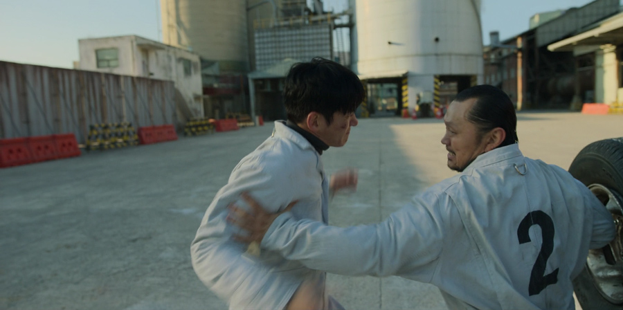 C’est alors que notre héros est renversé par un véhicule imposant : Deok Su revient sur le devant de la scène, bouillonnant de rage. Sous un soleil partiellement éblouissant (les plans ont probablement été tournés en fin de journée), Deok Su tabasse Tae Joong, qui réplique avec un coup de genou. S’ensuit un affrontement brutal où les coups de poing, les coups de couteau et les empoignades s’enchaînent à l’écran.